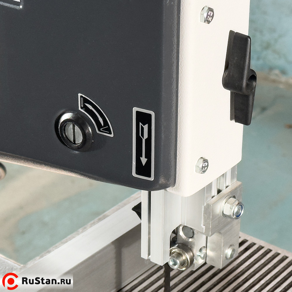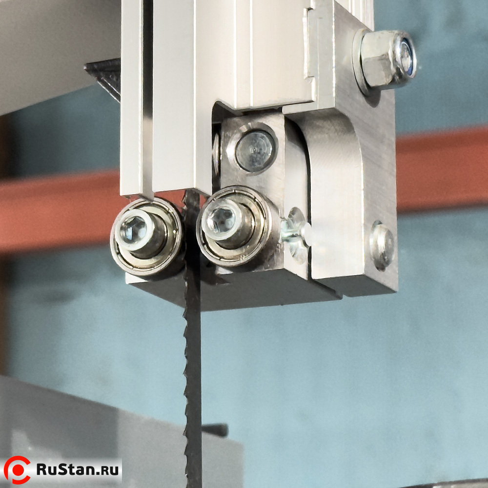 Вылет верхнего блока направляющих подшипников устанавливается в зависимости от толщины разрезаемого материала. Для получения точного и качественного среза, расстояние между верхним блоком направляющих подшипников и обрабатываемым материалом должен быть минимальным, но при этом заготовка должна свободно перемещаться на столе (рекомендуемый зазор между верхним блоком направляющих и заготовкой 3 – 5 мм)