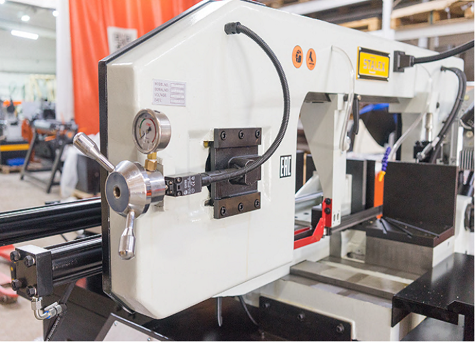 На автоматических станках возможна работа как в ручном режиме (каждая операция выполняется вручную посредством нажатия соответствующей кнопки), так и в автоматическом режиме, когда станок выполняет весь цикл резания: зажим заготовки – подвод заготовки – запуск пилы – опускание рамы – остановка пилы – подъем рамы – отжим тисков. В автоматическом режиме оператору необходимо лишь обеспечить подачу заготовок, предварительно настроить концевой ограничитель на необходимую длину получаемых заготовок и запустить цикл пиления кнопкой «Пуск».