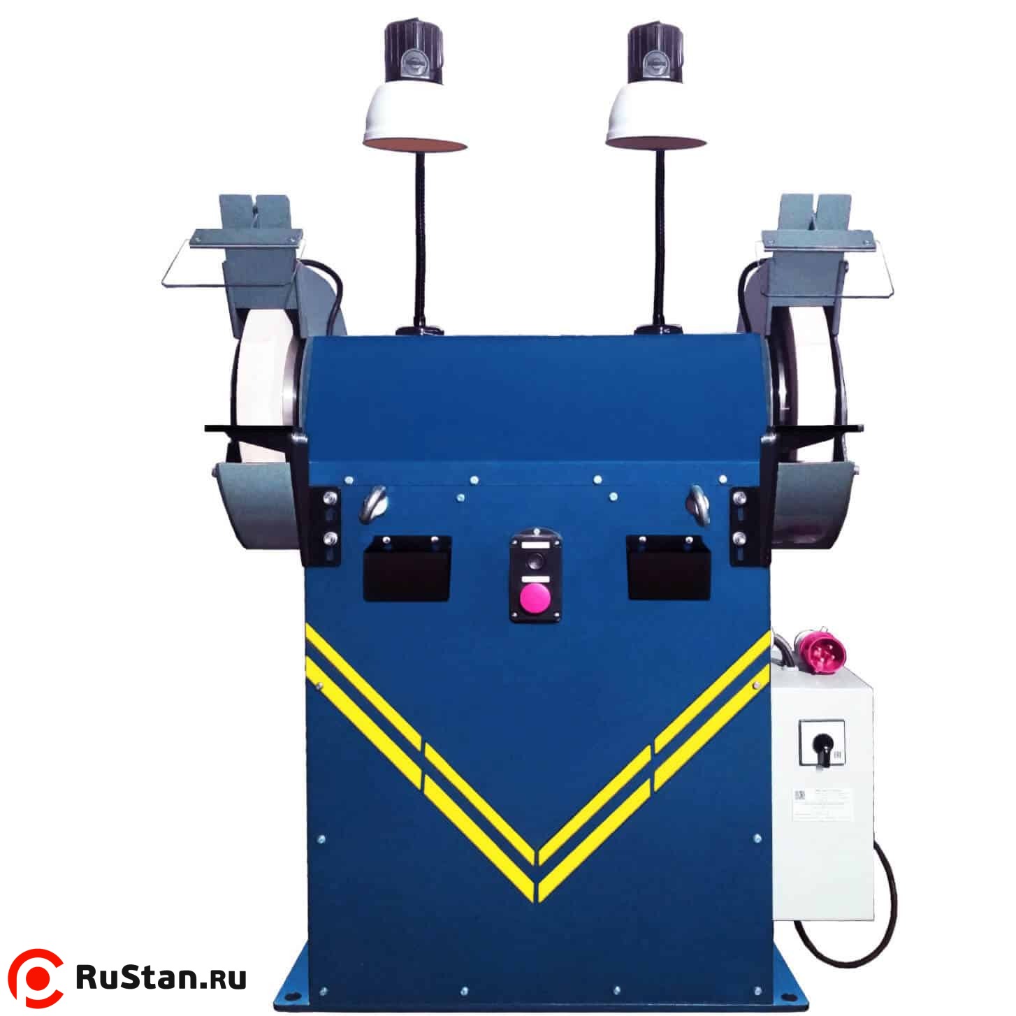 На станок установлен концевой выключатель для блокировки двигателя при поднятии защитного экрана. Регулировка упоров по горизонтали и вертикали обеспечивает удобную работу на станке. Установлены съемные металлические ёмкости для охлаждающей жидкости. Защитные кожуха имеют выходные вентиляционные патрубки для подключения пылеотсосов, позволяющих фильтровать воздух от абразивной пыли в рабочей зоне оператора.