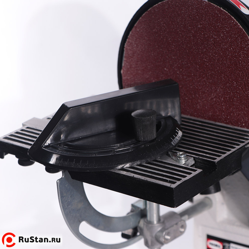 В данной модели предусмотрена возможность наклона рабочего стола шлифовального круга, что позволяет обрабатывать детали под углом. Так же включена опция подъёма поворотного плеча на 90 градусов.