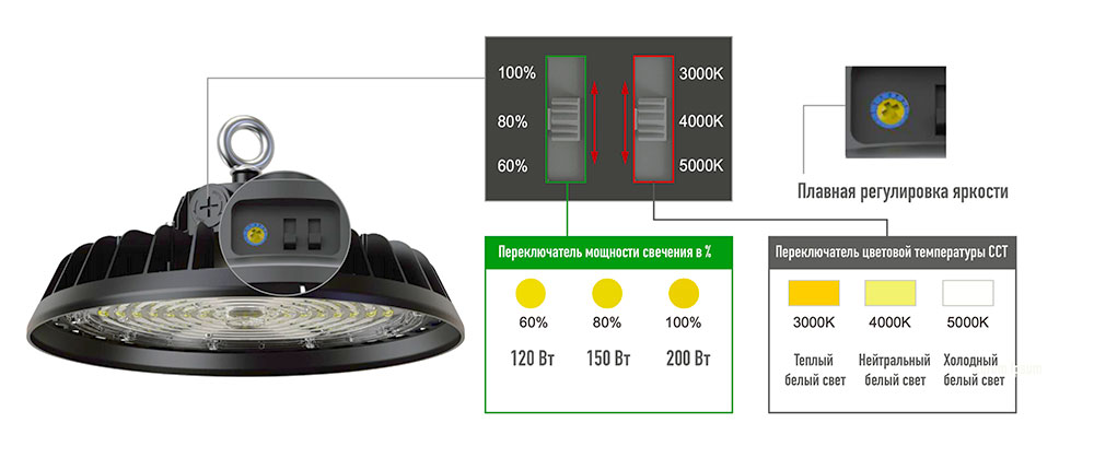 • Три переключаемых режима цветовой температуры (CCT) — 3000К/4000К/5000К;